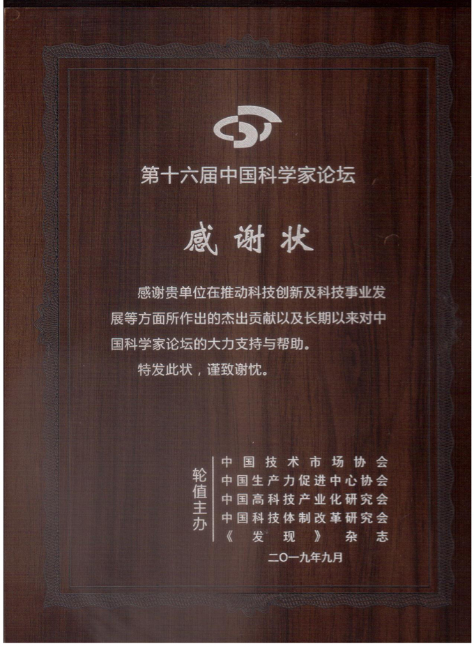 第十六届中国科学家论坛感谢状